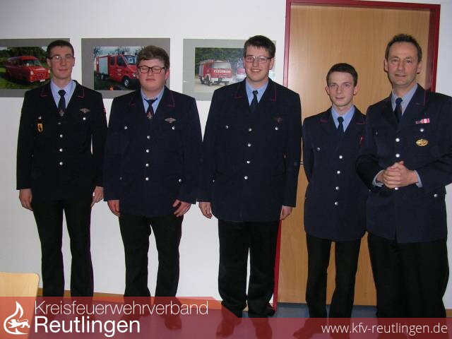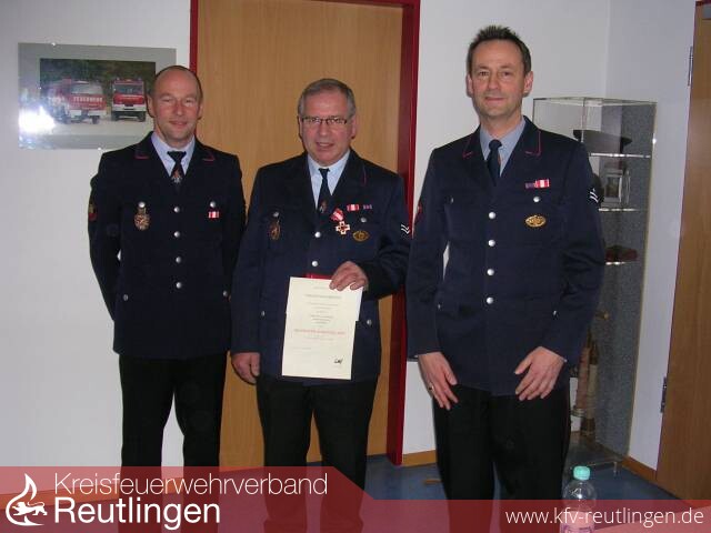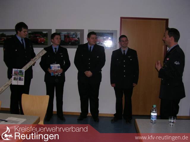 Beim folgenden Punkt Ehrungen konnte der Ehrenkommandant Hermann Thüringer vom stellv. Kreisbrandmeister Hartmut Holder mit dem Ehrenzeichen in Gold des Landes Baden- Württemberg für 40 Jahre aktiven Feuerwehrdienst ausgezeichnet werden. Auf 30 Jahre Dienst konnte Achim Knöll zurückblicken während der leider verhinderte Simon Schur das 10-jährige Dienstjubiläum feiern konnte. Kommandant Stefan Kleemann bedankte sich bei allen geehrten für Ihre langjährige treue zur Feuerwehr. Auch insgesamt acht Beförderungen gab es zu vermelden. Felix Schur, Patrick Schurr, Marcel Stiefel und Dominik Wurster konnten zum Feuerwehrmann ernannt werden. Carolin Bader wurde zur Oberfeuerwehrfrau befördert und Gerd Albers darf sich nun Hauptfeuerwehrmann nennen. Nach erfolgreich abgelegtem Gruppenführerlehrgang wurde Phillip Knöll Löschmeister und Daniel Thüringer ist nach abgelegtem Zugführerlehrgang nun Brandmeister. Beim Punkt Neuaufnahmen konnten zwei junge Damen nun offiziell in der aktiven Wehr begrüßt werden. Corinna Ulbricht und Anna Thüringer kamen bereits im letzten Jahr aus der eigenen Jugendfeuerwehr und erhöhen damit den Frauenanteil auf 12,2 %. Leider gab es aber auch eine Verabschiedung zu vermelden. Nach 32 Dienstjahren wechselt Karl Lutz aus beruflichen Gründen in die Altersabteilung. Nun stand der wichtige Punkt Wahlen auf der Tagesordnung. Insgesamt galt es drei Ausschussmitglieder und den Kommandanten zu wählen. Nachdem Ausschussmitglied Hermann Bader angekündigt hatte nicht mehr kandidieren zu wollen bedankte sich der Kommandant bei Hermann Bader für 29 Jahre Tätigkeit im Ausschuss. In dieser Zeit sei Hermann Bader an zahlreichen Entscheidungen aktiv beteiligt gewesen, wofür er sich mit einem Geschenk nochmals ganz herzlich bedanken wolle. Als Ersatz wurde sein Sohn Sven Bader mit großer Mehrheit in den Ausschuss gewählt wodurch das Amt in der Familie bleibt. Wiedergewählt wurden Marco Fischer und Matthias Trost für weitere 5 Jahre im Ausschuss. Die wichtigste Wahl folgte zum Schluss unter der Wahlleitung vom Vizekommandanten Marco Hellmig wurde Stefan Kleemann einstimmig auf weitere 5 Jahre als Kommandant der Grafenberger Feuerwehr bestätigt.