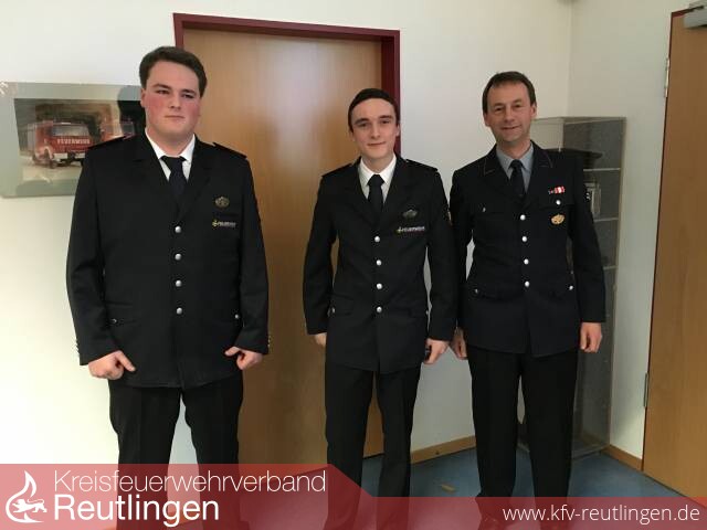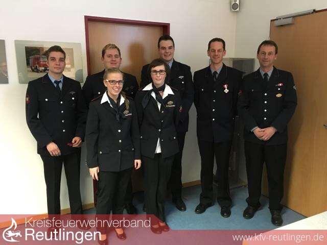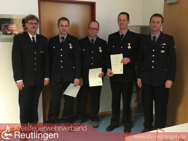 Beim folgenden Punkt Ehrungen konnten mit Martin Kleemann, Matthias Trost und Gunther Kleemann gleich drei Kameraden für 25 Dienstjahre ausgezeichnet werden. Kreisbrandmeister Wolfram Auch überreichte allen das Feuerwehrehrenzeichen des Landes Baden-Württemberg in Silber und gratulierte recht herzlich. Auch Kommandant Stefan Kleemann beglückwünschte die Jubilare und überreichte den Ehrenteller der Grafenberger Feuerwehr zusammen mit einem guten Tropfen. Auf 20 Dienstjahre konnte Ralf Kittelberger zurückblicken, 10 Jahre im Dienst ist Judith Bader. Auch insgesamt sechs Beförderungen gab es zu vermelden. Anna Thüringer und Corinna Ulbricht konnten zur Feuerwehrfrau ernannt werden. Timo Kern und Markus Liedtke dürfen sich nun Oberfeuerwehrmann nennen. Nach erfolgreich abgelegtem Gruppenführerlehrgang wurde Manuel Stiefel zum Löschmeister und Martin Kleemann trägt nun das Abzeichen des Oberlöschmeisters. Beim Punkt Neuaufnahmen konnten Felix und Max Thüringer nun offiziell in der aktiven Wehr begrüßt werden. Beide kommen aus der eigenen Jugendfeuerwehr und sind seit Mitte letzten Jahres im aktiven Dienst. Leider gab es auch eine Verabschiedung zu vermelden. Nach 35 Dienstjahren wechselte Bernd Früh aus beruflichen und gesundheitlichen Gründen in die Altersabteilung. Er konnte wegen Krankheit leider nicht anwesend sein. Nun stand der Punkt Wahlen auf der Tagesordnung. Einstimmig wiedergewählt wurden die bisherigen Amtsinhaber Ralf Wurster als Schriftführer und als Kassier, sowie Ralf Kittelberger als Kassenprüfer.