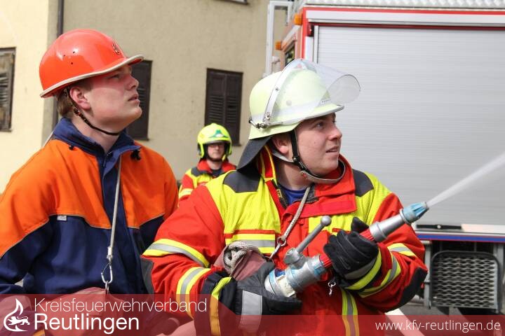 Am Samstag, den 30. April, war es dann soweit. Morgens wurde der schriftliche Leistungsnachweis abgelegt. Anschließend ging es mit drei Löschgruppen zur praktischen Prüfung zum „Mahler Areal“. Dort ging man von einem ausgedehnten Wohnungsbrand in einem Mehrfamilienhaus aus. Geprüft wurden das Stellen von tragbaren Leitern und die Menschenrettung über diese, der Aufbau eines dreiteiligen Löschangriffes sowie Knoten und Stiche.