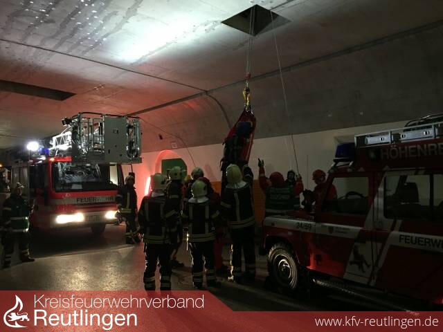 Zurück auf der Feuerwache ging es nahtlos in den Regelübungsdienst über. Ein Teil der Abteilung führte in der Baustelle des Scheibengipfeltunnels zusammen mit der Höhenrettungsgruppe eine Einsatzübung durch, während der andere Teil zeitgleich in der Atemschutzübungsanlage in Oferdingen die jährliche Wiederholungsübung absolvierte. Dabei müssen die Atemschutzgeräteträger der Feuerwehr einmal im Jahr ihre Fitness unter Beweis stellen, indem sie in voller Schutzausrüstung und unter Atemschutz zunächst an mehreren Sportgeräten arbeiten und anschließend die Übungsstrecke bei Dunkelheit durchlaufen.
