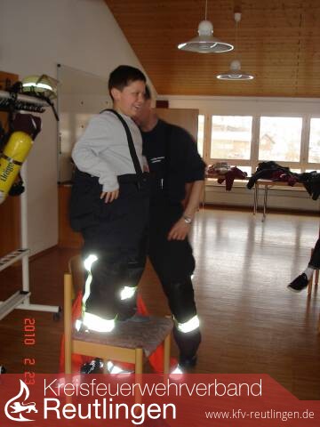 Nico Geiger stellte anschließend, unter Mithilfe seiner Adjutanten Justin und Theresa, die Kleider Garderobe der Feuerwehr vor. Jedes einzelne Kleidungs- und Ausrüstungsteil wurde vorgestellt und die jungen Models schlüpften gekonnt hinein, bis sie als vorzeige Feuerwehrmännlein/Fräulein vor Ihren Mitschülern standen.
