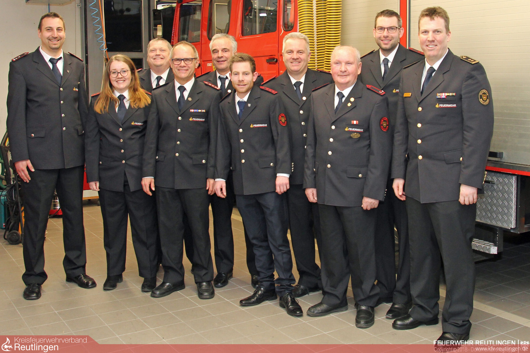 Beim letzten Tagesordnungspunkt der Versammlung, Ehrungen und Beförderungen, hatten Adrian Röhrle und Axel Walker alle Hände voll zu tun. Julia Gugel wurde zur Oberfeuerwehrfrau, Daniel Koch zum Hauptfeuerwehrmann befördert. Axel Walker selbst konnte die Beförderung zum Oberbrandmeister entgegennehmen. Für 20 Jahre Feuerwehrzugehörigkeit wurden Florian Gehr und Daniel Koch ausgezeichnet. Andreas Fischinger und Markus Henes erhielten die Ehrennadel für eine 30 - jährige Mitgliedschaft, Ralf Henes und Peter Schlotterbeck für 35 Jahre, Eckard Hannes für 50 Jahre Mitgliedschaft in der Reutlinger Feuerwehr.