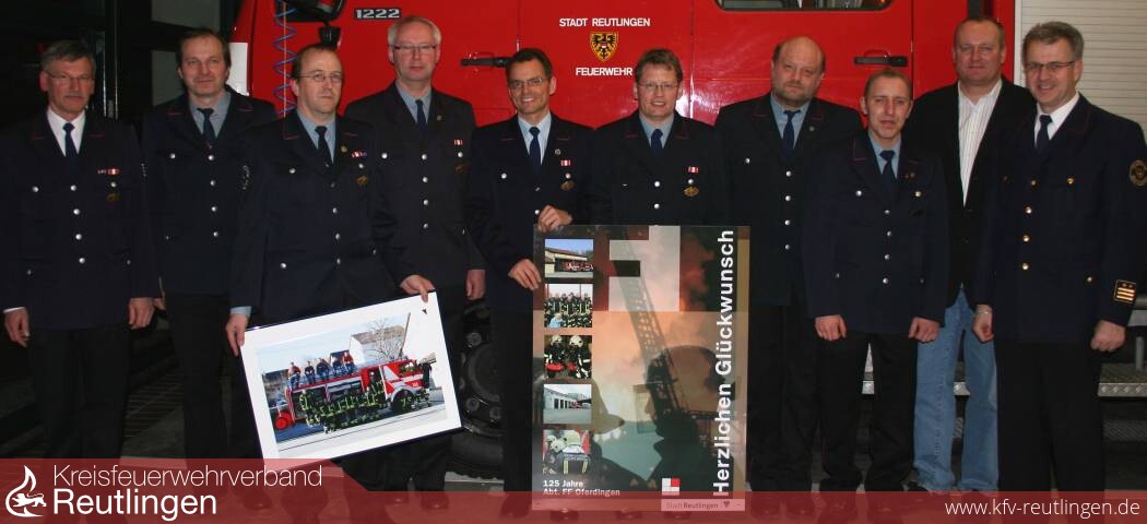 Das Einsatzaufkommen war mit zwei Brandeinsätzen und zwei Technischen Hilfeleistungen erfreulich gering. Der 14-tägige Übungsdienst, eine gemeinsame Übung mit der Einsatzabteilung Reutlingen-Mittelstadt zur Verbesserung der überörtlichen Zusammenarbeit, die Sanitätsausbildungen mit dem Deutschen Roten Kreuz sowie diverse Veranstaltungen der Jugendfeuerwehr und der Altersabteilung hielten die Mannschaft auf Trab. Sieben Kameraden legten zudem die Prüfung für das Feuerwehr-Leistungsabzeichen in Bronze ab. Der traditionelle Mutschelabend, ein Grillfest, die Mitwirkung beim Dorffest, der Ausflug nach Dinkelsbühl, das Maibaum- und Christbaumstellen sowie die Weihnachtsfeier waren weitere Höhepunkte des vergangenen Jahres. Feuerwehrkommandant Harald Herrmann überbrachte die Glückwünsche der Stadt und der Feuerwehr zum diesjährigen 125-jährigen Jubiläum der Feuerwehrabteilung Oferdingen. Anschließend beförderte Harald Herrmann Winfried Herrmann und Alexander Kilfitt zu Oberlöschmeistern sowie Jürgen Nickel und Bernd Greiner zu Hauptlöschmeistern. Benjamin Linhart wurde für die 15-jährige Mitgliedschaft bei der Feuerwehr Reutlingen mit einer Ehrennadel geehrt. Nach 21 Jahren gab Jugendgruppenleiter Edgar Pregizer sein Amt an Kathrin Pregizer weiter. Zum Dank für seine Arbeit und seine Verdienste erhielt er einen Geschenkkorb sowie ein Abschiedsfoto überreicht. Abschließend präsentierten Edgar und Kathrin Pregizer eine Bilderschau mit zahlreichen Bildern und Dokumenten aus der 125-jährigen Geschichte der Feuerwehr in Oferdingen. Diese wird auch beim Tag der offenen Tür im Juli dieses Jahres für alle Interessierten zugänglich sein.