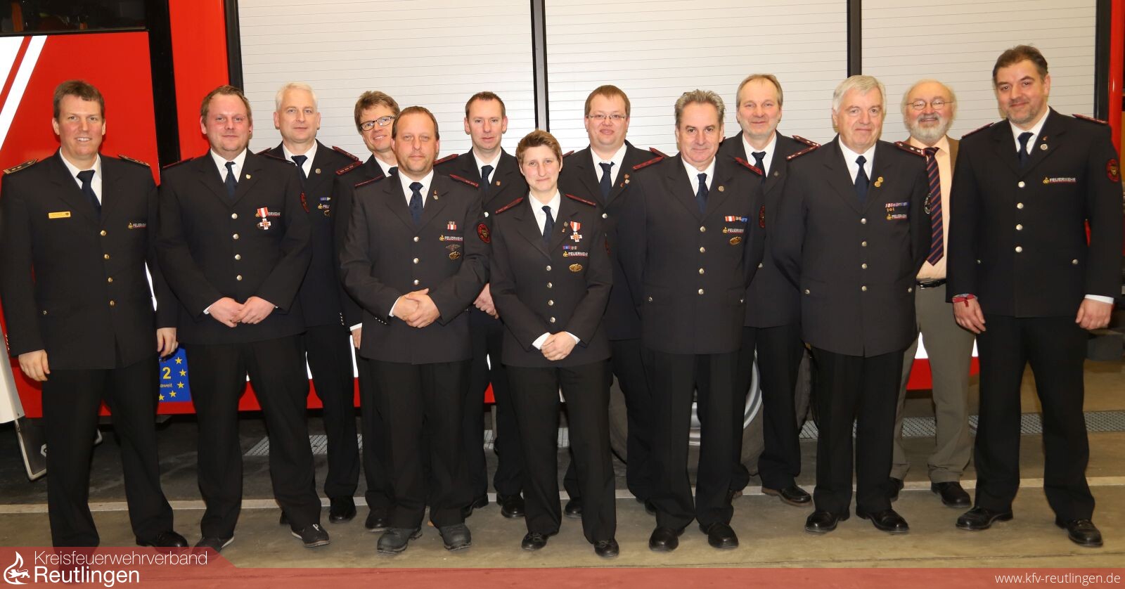 Nach seinen Grußworten überreichte der Stellvertretende Kommandant der Feuerwehr Reutlingen Adrian Röhrle Armin Knapp nach 43 aktiven Dienstjahren die Ernennungsurkunde zum Ehrenmitglied. Danach konnte er Kathrin Pregizer zur Oberlöschmeisterin, Timo Linhart zum Oberlöschmeister und Frank Greiner zum Hauptlöschmeister befördern und weitere vier Feuerwehrangehörige mit dem neuen Ehrenzeichen des Landes in Bronze für eine 15-jährige Dienstzeit auszeichnen. Für langjährige Mitgliedschaft bei der Feuerwehr Reutlingen wurden Stephan Rietzke (15 Jahre) und Markus Herrmann (20 Jahre) geehrt. Auf beachtliche 60 Jahre Mitgliedschaft bringt es Ehrenkommandant Walter Greiner. Zum Abschluss des Tagesordnungspunktes Ehrungen und Beförderungen durften sich Hanspeter Kimmerle und Frank Greiner nach entsprechenden sportlichen Leistungen im Vorjahr über die Verleihung des Feuerwehr-Fitness-Abzeichens in der Stufe Gold freuen.