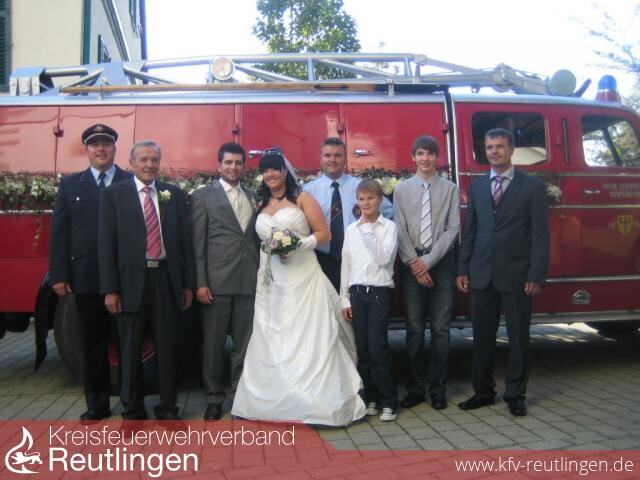 Standesgemäß wurde das Hochzeitspaar an diesem Tag im historischen Feuerwehrfahrzeug chauffiert. Der Rüstkraftwagen RKW 7, Baujahr 1954, gehört allerdings nicht der Feuerwehr Pliezhausen. Er wurde, wohl nicht zuletzt aufgrund der langjährigen, sehr guten Zusammenarbeit mit der Berufsfeuerwehr Reutlingen, vom Kommandanten Harald Herrmann zur Verfügung gestellt.