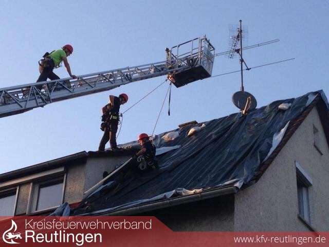 Am Sonntag, Montag und Dienstag war die Feuerwehr Pfullingen mit allen verfügbaren Kräften und Fahrzeugen im Stadtgebiet Pfullingen im Einsatz um die schlimmsten Unwetterfolgen einzudämmen. Insbesondere galt es, undichte und beschädigte Dächer soweit abzudichten, dass bei Regenfällen keine weiteren Sachschäden entstanden. Außerdem mussten Äste und Bäume aus dem Weg geräumt, Verkehrswege teilweise unter Einsatz von Schneepflügen geräumt und Wasserschäden beseitigt werden. Insgesamt war die Feuerwehr in Pfullingen an den ersten drei Tagen nach dem Unwetter an 88 Einsatzstellen gefordert. Darüber hinaus kam es neben den unwetterbedingten Einsätzen zu weiteren Alarmierungen, unter anderem wurde eine Person nach einem Verkehrsunfall aus einem umgestürzten PKW befreit, im städtischen Freibad eine Personengefährdung durch Insekten beseitigt und am Georgenberg einer Rauchentwicklung auf den Grund gegangen. Unterstützung erfuhren die Einsatzkräfte durch die Kollegen der Feuerwehr Trochtelfingen und Mitarbeiter des Städtischen Bauhofs. Insgesamt wurden während dieser 3 Tage insgesamt 222 Einsatzkräfte an den verschiedenen Einsatzstellen eingesetzt, die dabei zusammen 1381 Einsatzstunden leisteten.