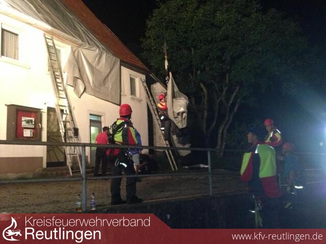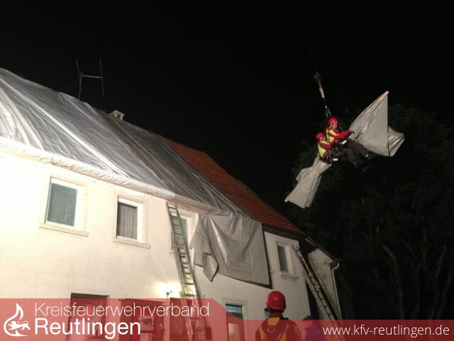 In Pfullingen galt es aber lediglich an zwei Einsatzstellen Dächer erneut abzudichten, die bereits beim Hagelsturm der Vorwoche beschädigt waren. Ab 16.00 Uhr rückten dann in Folge insgesamt 9 Fahrzeuge mit 35 Einsatzkräften aus Pfullingen zur Überlandhilfe nach Sonnenbühl aus. Gemeinsam mit Feuerwehren aus dem gesamten Landkreis und darüber hinaus wurden zahlreiche Dächer notdürftig abgedichtet bzw. gesichert. Außerdem unterstützte die Führungsunterstützungseinheit die örtliche Einsatzleitung bei der Erfassung, Dokumentation, Erkundung und Koordinierung der eingehenden Einsatzmeldungen. Gegen 01.00 Uhr wurde die Einsatztätigkeit eingestellt, da die Unfallgefahr (Dunkelheit, Regen,…)für die eingesetzten Kräfte zwischenzeitlich zu hoch geworden war.
