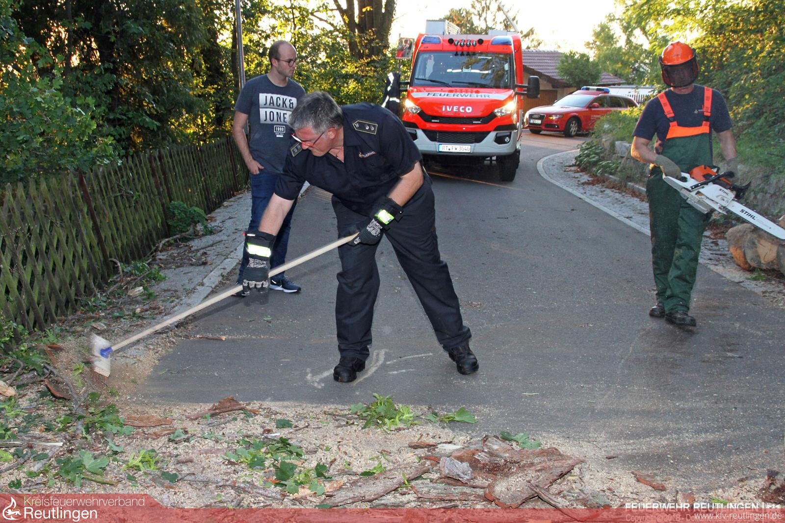 Als um 19:00 Uhr das Abendessen auf dem Tisch stand, war nur eine kleine Stärkung möglich. Das Abendessen wurde „wie im Film“ von einem Einsatz unterbrochen. Ein morscher Baum quer über eine Straße musste beseitigt werden. Zum Glück wurde niemand durch den Baum verletzt. Die Zerlegung des mächtigen Baumes dauerte dann bis zum Sonnenuntergang an.