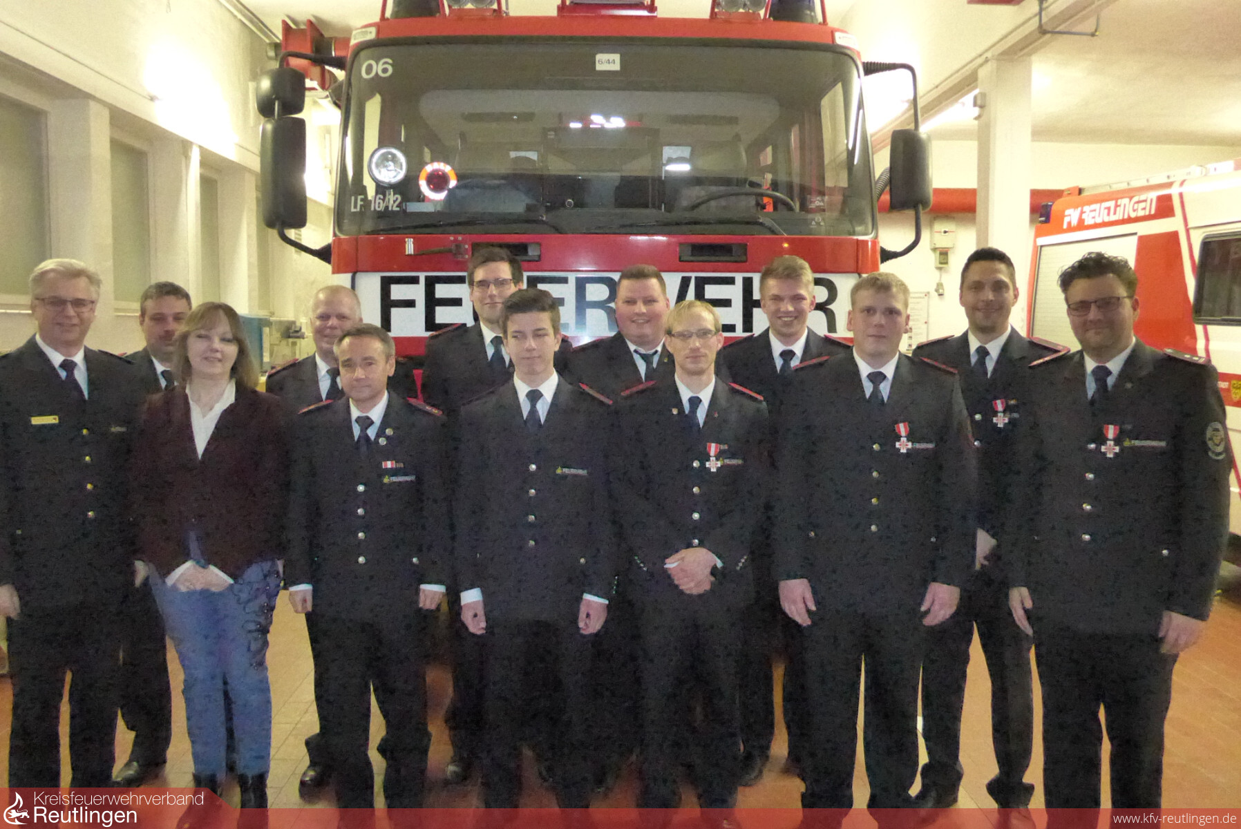 Zum Abschluss der Versammlung konnten zahlreiche Kameraden befördert und geehrt werden: Maximilian Warnke wurde in die Einsatzabteilung aufgenommen. Zum Feuerwehrmann wurden befördert Maurice Boley und Benedikt Kern; zum Hauptfeuerwehrmann Oliver Nagel und zum Oberlöschmeister Norbert Scheuer. Für 30jährige Mitgliedschaft in der Feuerwehr Reutlingen wurde Stefan Dürr geehrt. Das Landesehrenzeichen in Bronze für eine 15-jährige Mitgliedschaft bei der Feuerwehr wurde an Oliver Nagel, Tim Schultze, Oliver Theilacker, Andreas Wacker, Michael Schairer und Marcus Wandel verliehen. Für herausragenden Übungsfleiß und lückenlose Übungsbesuche konnten die Kameraden Lukas Braun, Christian Dvornicki, Oliver Theilacker, Marcus Wandel und Uwe Weimar geehrt werden.