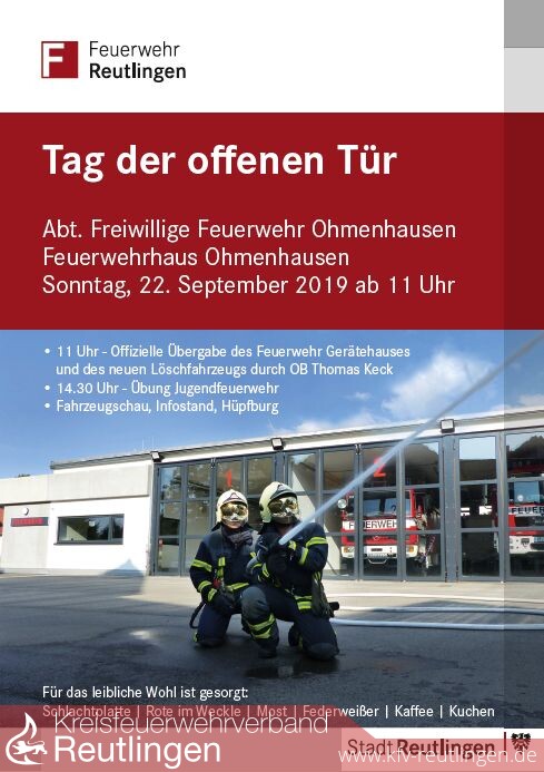 Am kommenden Sonntag, den 22. September 2019 lädt die Abteilung Freiwillige Feuerwehr Ohmenhausen ab 11.00 Uhr zum Tag der offenen Tür ins Feuerwehrhaus in der Wasenstraße 49 ein. Erstes Highlight der Veranstaltung ist die offizielle Übergabe Feuerwehrgerätehaus und des neuen Löschfahrzeugs durch Oberbürgermeister Thomas Keck um 11.00 Uhr, bevor die Jugendfeuerwehr um 14.30 Uhr ihr Können präsentiert. Unterhaltung bieten zudem eine Fahrzeugschau, ein Informationsstand und eine Hüpfburg für die Kleinsten.