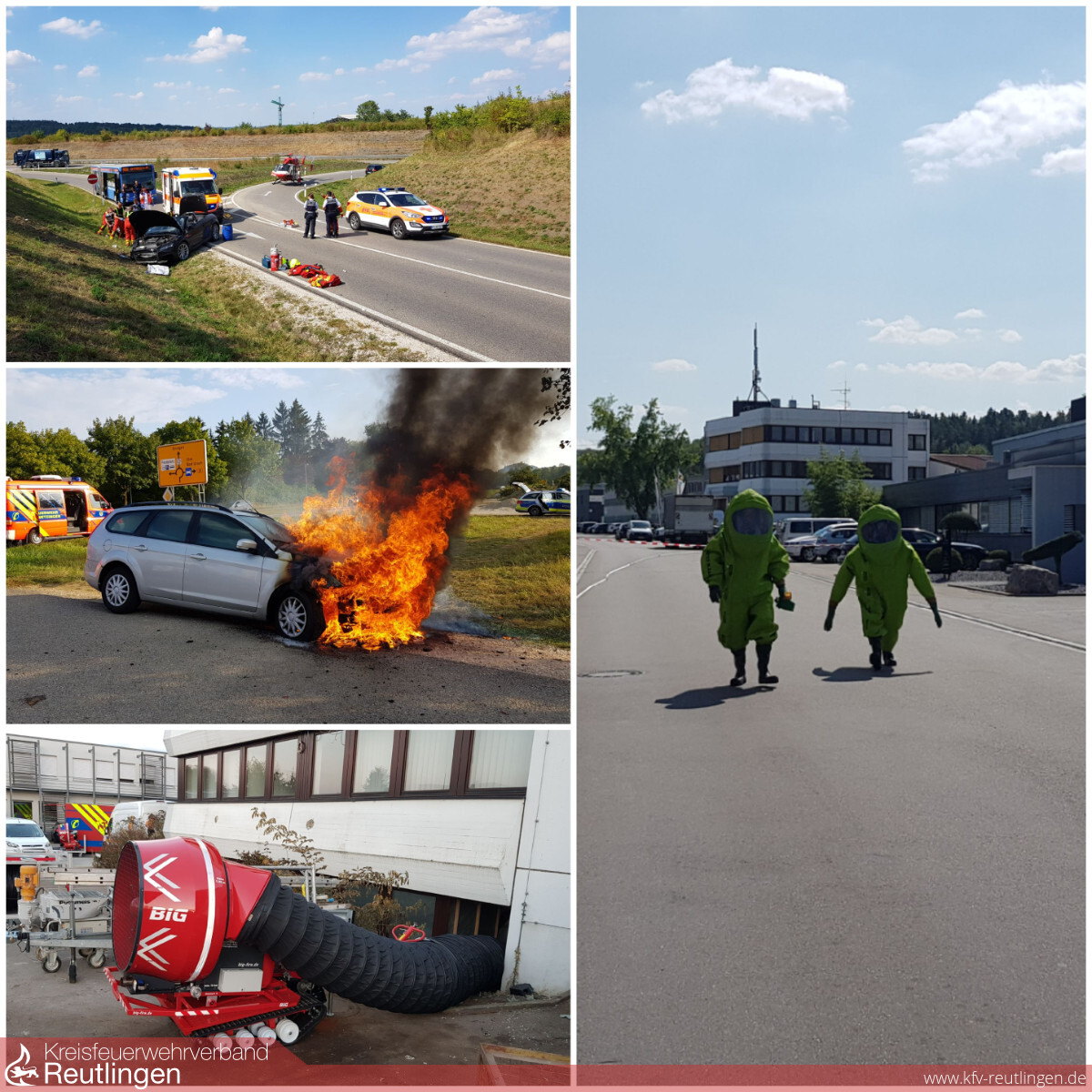 Der erste und zugleich zeitaufwendigste Einsatz begann am Montag um 12:37 Uhr. Zusammen mit dem Gefahrstoffzug Ermstal und der Feuerwehr Riederich wurde die Feuerwehr Metzingen zu einem Gefahrstoffaustritt in das Riedericher Industriegebiet gerufen. In einer Entsorgungsfirma kam es bei Aufräumarbeiten mit einem Bagger zu Beschädigungen mehrerer nicht beschrifteter Gasflaschen. Dadurch ist es zu einem sofortigen Austritt eines zunächst nicht bekannten Mediums gekommen. Beim Eintreffen der Feuerwehr klagten bereits mehrere Personen der umliegenden Firmen über Atemwegsbeschwerden. Sofort wurden sämtliche Firmen geräumt und die betroffenen Personen von einem Großaufgebot der Rettungskräfte untersucht. Die Bergung der Flaschen gestaltete sich zunächst sehr schwierig, da diese noch unter einer Baggerschaufel eingeklemmt waren und die Arbeiten nur mit Chemikalienschutzanzügen durchgeführt werden konnten. Um etwa 17:30 Uhr war der Einsatz für die Feuerwehr Metzingen beendet.