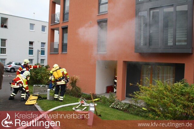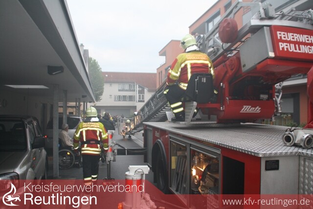 Im Altersgerechten Wohnen \"Haus am Stadtgarten\" in Pfullingen fand am Donnerstag 13.10.2011 eine Überprüfung des vorhandenen Feuerwehreinsatzplans durch. Auch wurde das Zusammenspiel zwischen Feuerwehr, DRK und Heimleitung geprobt. Angenommen wurde ein mit brennender Zigarette im Bett eingeschlafener Hausbewohner. Durch die daraus resultierende Rauchentwicklung wurde die Pflegekräfte auf den Brand aufmerksam. Durch öffnen der Zimmertüre kam es zur Verrauchung des Flures - der Fluchtweg der restlichen Bewohner in diesem Bereich war abgeschnitten.