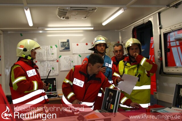 Bei der Übung war neben der Einsatzabteilung, die mit einem erweitertem Löschzug anrückte auch die Führungsunterstützungseinheit der Feuerwehr Pfullingen im Einsatz. Neben dem DRK Pfullingen war auch das Kreisauskunftsbüro sowie die realistische Unfalldarstellung des DRK Kreisverbandes mit dabei.