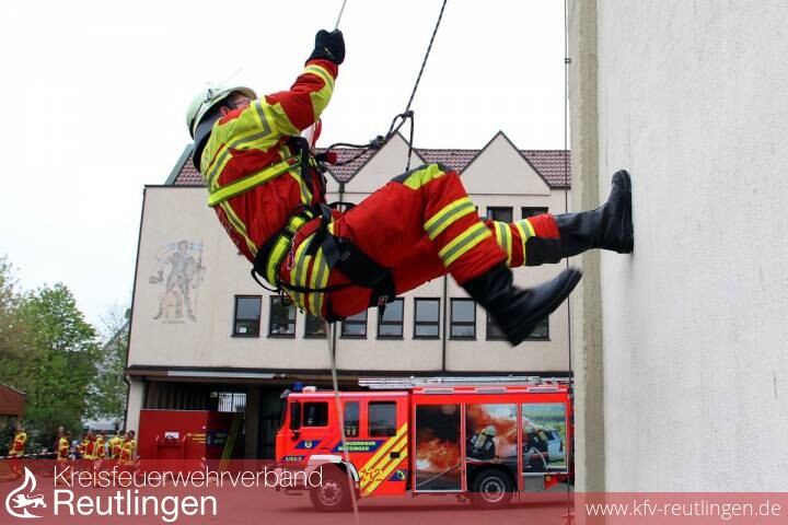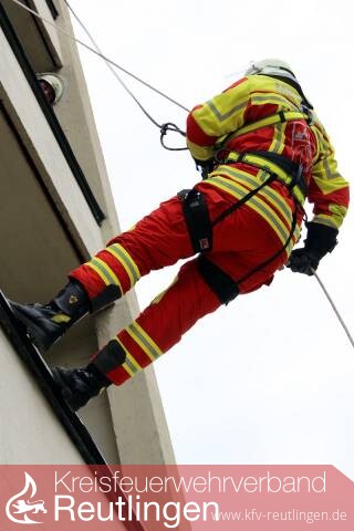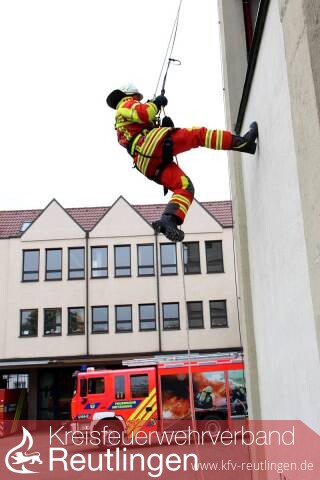22 Kameraden der Abteilung Stadtmitte lernten im Theorieteil den Zweck, den Aufbau, die Sicherheitshinweise, das Halten bzw. Rückhalten, das richtige Einlegen in die Brandschutzjacke und die Bedienung des Gurtes. Am späten Vormittag konnten dann die Lehrgangsteilnehmer die erlernte Theorie bei den praktischen Übungen umsetzten. Neben einer Station, bei der sämtliche Knoten nochmals geübt und vertieft wurden, wurden die verschiedenen Einsatzbereiche des Gurtes wie z.B. das Rückhalten auf Flachdächern mit einem Sicherungsmann gezeigt und ebenfalls geübt. Das Highlight für alle Teilnehmer war wohl die Station, bei der man sich in Selbstrettungsabsicht vom Schlauchturm abseilen musste. Diese Rettungsmethode wird angewandt, wenn alle Rettungswege nicht mehr benutzbar oder erreichbar sind und eine hohe Gefährdung für die Gesundheit und das Leben der Einsatzkraft besteht.