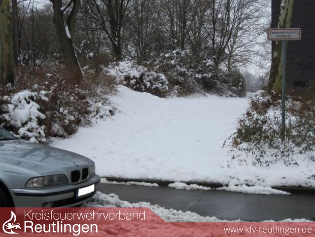 Bildbeschreibung: Feuerwehrzufahrt, verschneit und zugeparkt.