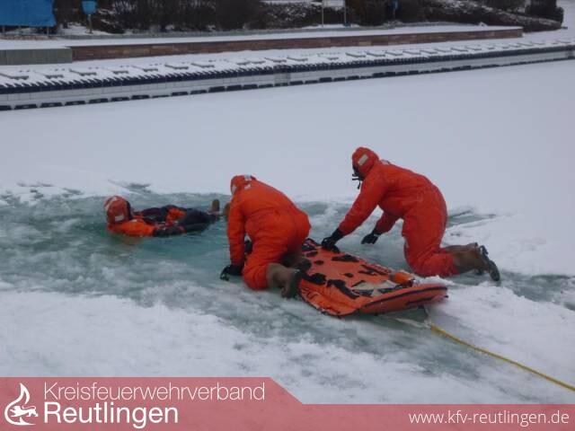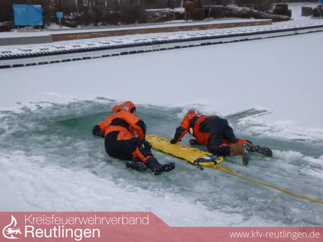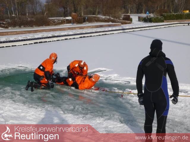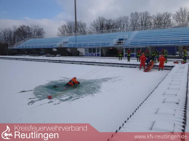 Während momentan niemand an einem Besuch im Freibad denkt, nutzte die Reutlinger Feuerwehr das derzeitige Winterwetter mit Dauerfrost, die Eisrettung im Eis und Schnee bedeckten Schwimmbecken des Freibades Markwasen zu trainieren.