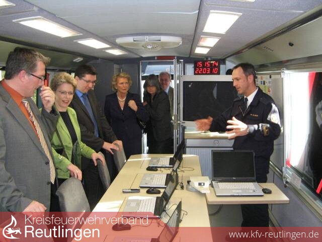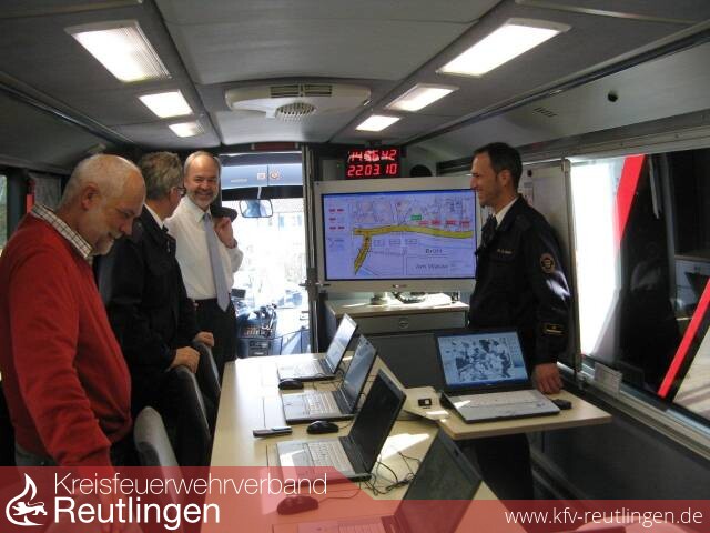 Das Fahrzeug gliedere sich, so Herrmann, in 4 Raume; einem Fahrer- undFachberaterraum, einem Führungsraum für die Einsatzleitung, dem Fernmeldebetriebsraum und einen Technikraum. Die technische Austattung des Fahrzeuges und den Betrieb erläuterte im Anschluß der Stv. Kommandant der Reutlinger Feuerwehr, Dr. Georg Belge und der Leiter der Abteilung Technik, Martin Reicherter.