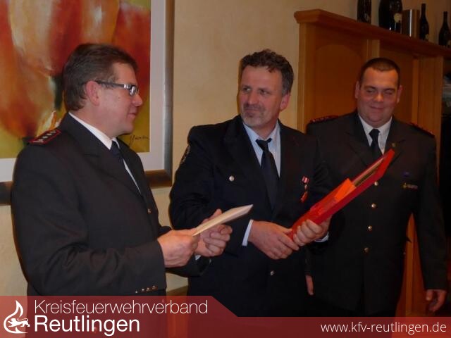 Mit der Feuerwehr-Ehrennadel der Stadt Reutlingen konnten für 15 Jahre Feuerwehrzugehörigkeit Pierre Heritier (Sickenhausen) und Andreas Binder (Reicheneck) ausgezeichnet werden. Für 20-jährige Zugehörigkeit konnte Marc Weiss (Sickenhausen), für 40-jährige Zugehörigkeit Dietmar Hartnagel (Sickenhausen) und für 60 Jahre Erich Diebold (sen.) (Altenburg) geehrt werden. Eine besondere Ehrung erfuhr Siegfried Schanz aus Sickenhausen, der nach 31 aktiven Dienstjahren bei der Feuerwehr in die Altersabteilung übertrat und zum Ehrenmitglied ernannt wurde.