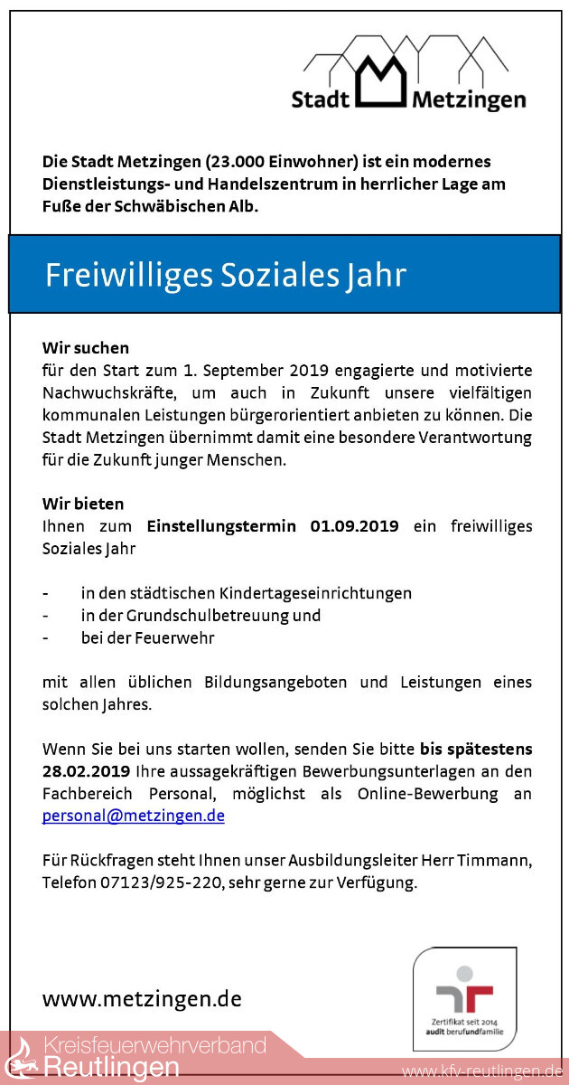 Wenn Sie bei uns starten wollen, senden Sie bitte bis spätestens 28.02.2019 Ihre aussagekräftigen Bewerbungsunterlagen an den Fachbereich Personal, möglichst als Online-Bewerbung an personalmetzingen.de