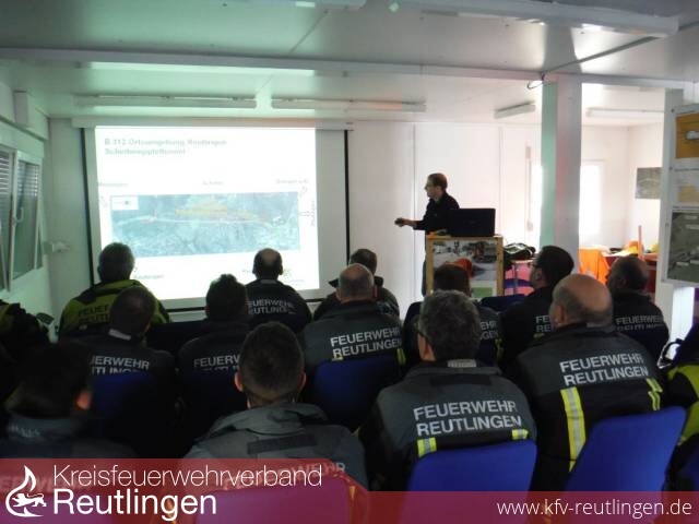 Seit der Übernahme der Aufgaben als Rettungswehr im Herbst 2012 werden die Einsatzkräfte der Feuerwehr Reutlingen regelmäßig im Tunneleinsatz geschult. Während Mitte der vergangenen Woche die Einsatzleiter der Berufsfeuerwehr die Reutlinger Tunnelbaustelle am Scheibengipfel besucht haben, waren es am Samstag nochmals rund 60 Führungskräfte aus allen Abteilungen der Feuerwehr, die der Einladung von Hartmut Möck, dem Sachgebietsleiter Aus- und Fortbildung gefolgt waren.