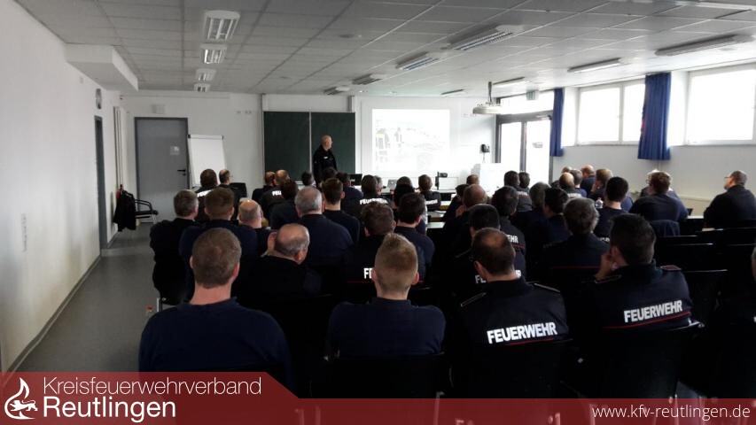 Die immer zweimal jährlich stattfindende Führungskräftefortbildung der Feuerwehr Reutlingen war beim Auftakt 2017 am vergangenen Samstag, den 11.03. mit 55 Teilnehmern wieder sehr gut besucht gewesen. Ausbildungsleiter Hartmut Möck konnte im Lehrsaal der Feuerwache Teilnehmer aus elf Abteilungen der Reutlinger Feuerwehr zu einer interessanten Vortragsreihe zu den Themen Hochwasser, Waldbrand und alternativer Energie begrüßen.