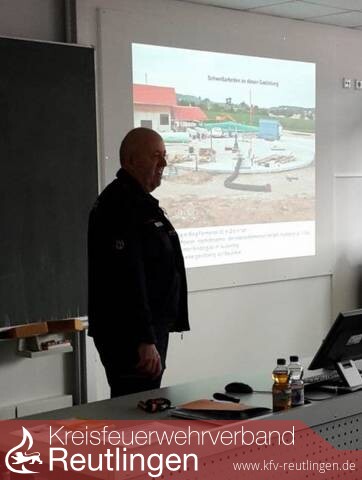 Nach aktuellen Einsatzinformationen zu Hochwassereinsätzen von Harmut Möck mit den Schwerpunkten Einsatztaktik und Erkundungsmaßnahmen folgte Peter Werner mit einem Vortrag zu Gefahren und Schutzmaßnahmen an Fahrzeugen mit alternativen Antrieben. Von Sandra Verardi, Ausbildungsbeamtin der Landesfeuerwehrschule Baden – Württemberg, die derzeit einen Ausbildungsabschnitt in Reutlingen absolviert, erhielten die anwesenden Führungskräfte Hinweise zur Waldbrandbekämpfung sowie zum Einsatzplan Schönbuch.