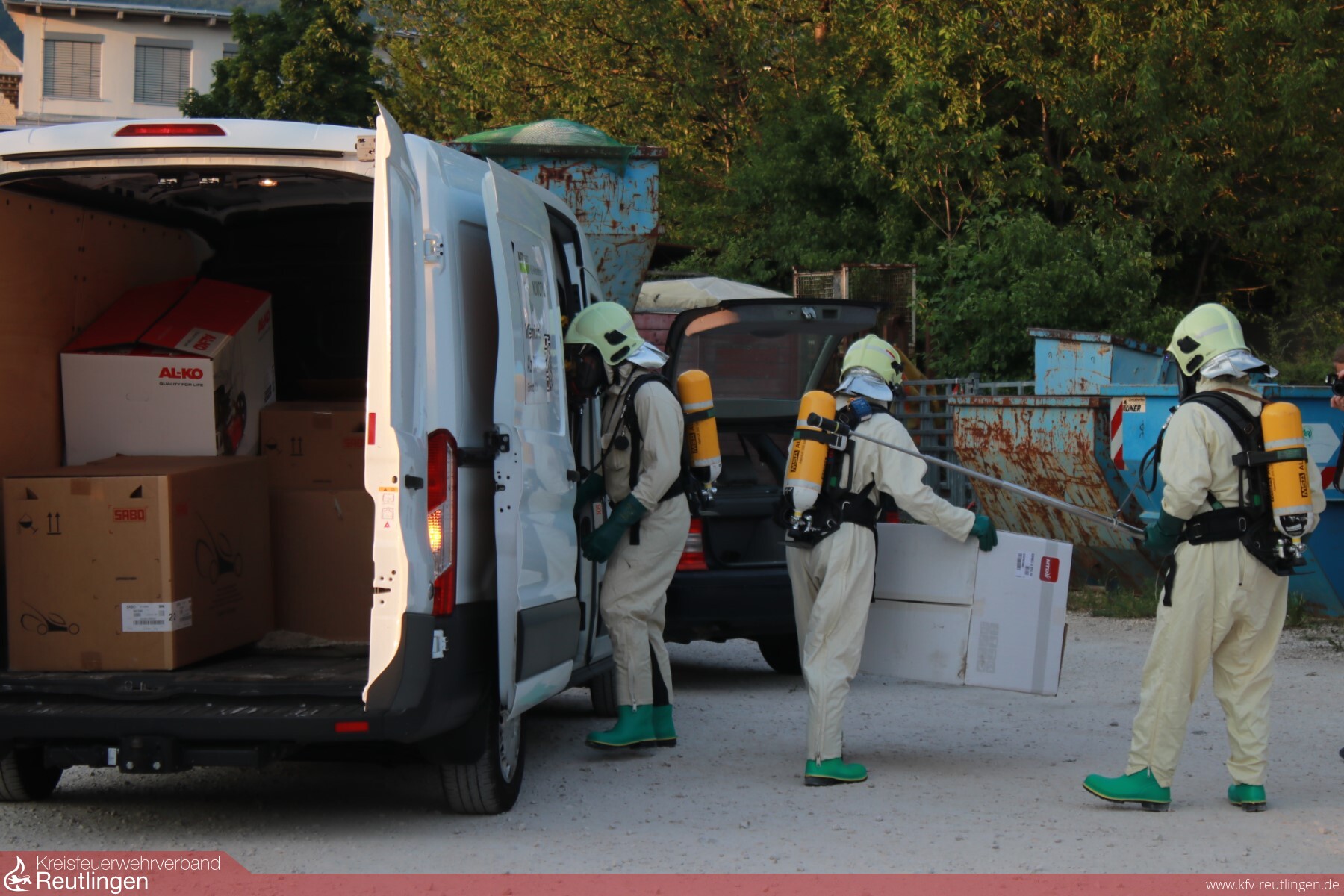 Mit entsprechender Schutzkleidung und Messtechnik wurde der Kleintransporter entladen und die beschädigten Versandstücke sicher verpackt.