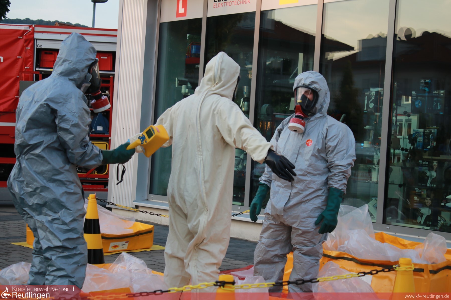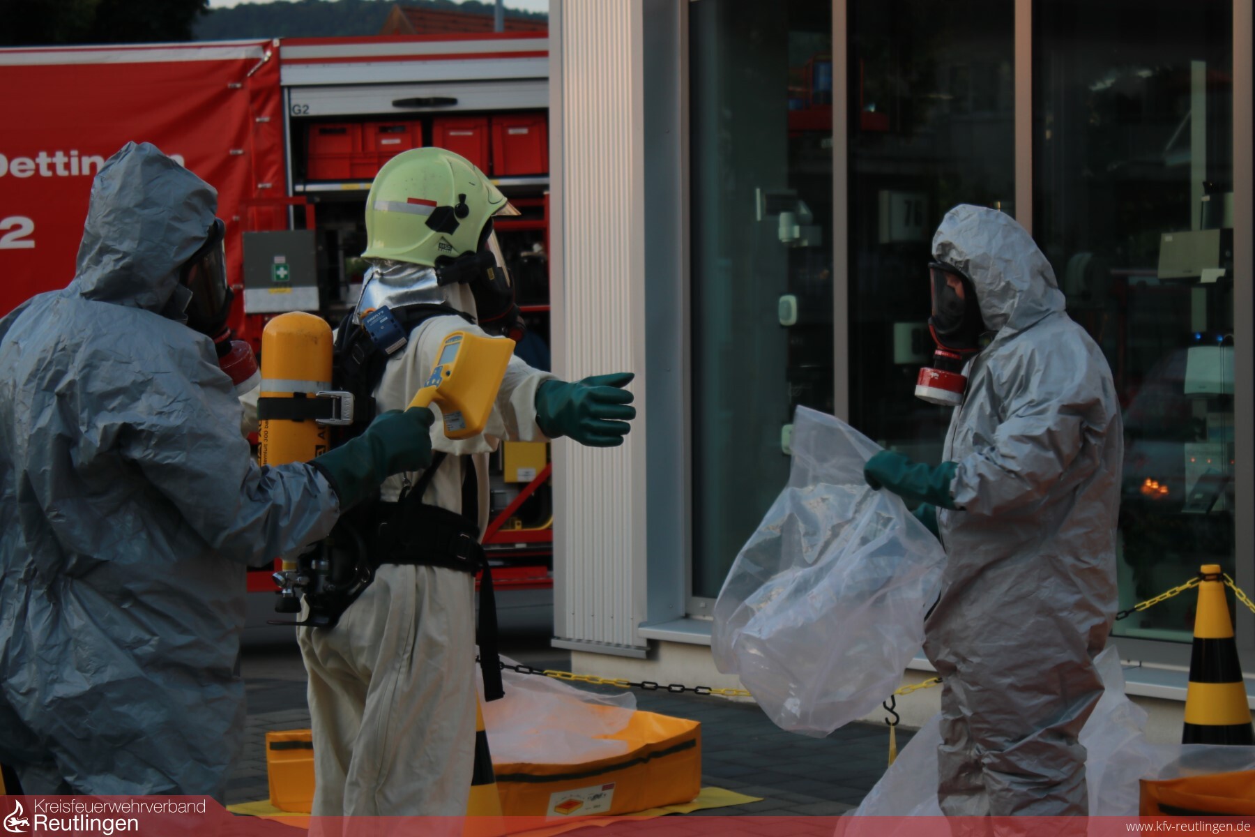Im Rahmen eines gemeinsamen Übungsdienstes übten die Strahlenschutzeinheiten der Feuerwehren Pfullingen und Dettingen die Zusammenarbeit der Sondereinheiten.