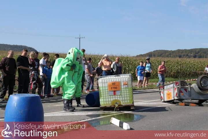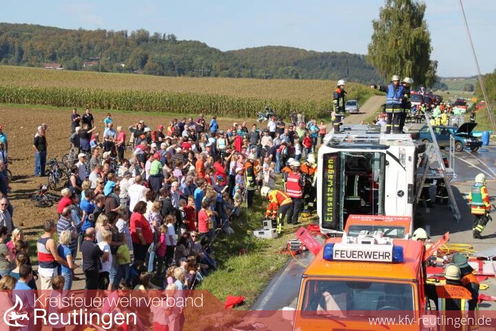 Das Szenario wirkte sehr realistisch. Auf der Straße von Kleinengstingen nach Holzelfingen lag ein Linienbus auf der Seite, aus dem Inneren klangen Hilferufe und Schmerzensschreie. Ein paar Meter weiter stand ein Auto quer, dichter Qualm drang aus dem Motorraum. Ein offensichtlich verletzter Mann hielt sich mit letzter Kraft am Fahrzeug fest. Ein Anhänger war umgekippt, zwei als Gefahrgut-Behälter gekennzeichnete Fässer, aus denen eine farbige Flüssigkeit austrat, lagen auf der Straße.