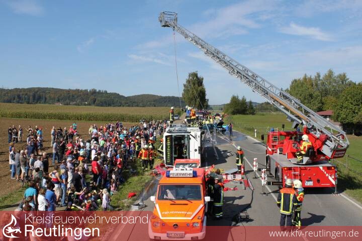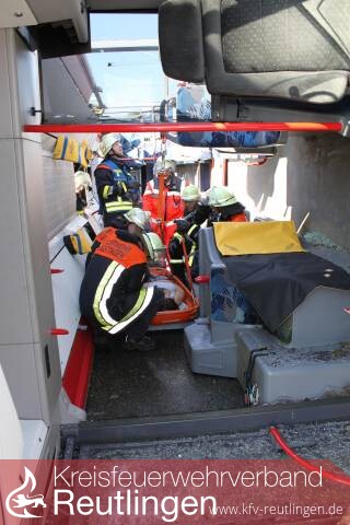 Weil im Übungsablauf zwei Businsassen nicht auf einfachem Weg befreit werden konnten, wurde zur Rettung aus der Luft die Drehleiter der Pfullinger Wehr angefordert. Trotz des scheinbaren Chaos war die Ruhe aller 120 Helfer zu spüren, die zwar zügig, manchmal auch im Laufschritt, aber beileibe nicht kopflos vorgingen. Im Vorfeld hatten die Führungskräfte der beteiligten Organisationen viele Stunden der Planung für diese Schauübung aufgewendet, bei der ein ehemaliger Übungsbus des SEK Göppingen eingesetzt werden konnte.