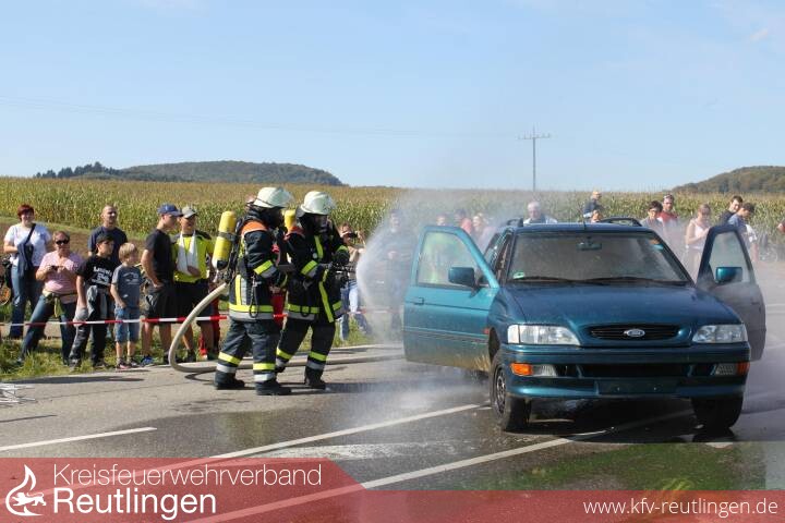 Mehr als fünfhundert Zuschauer nahmen die Gelegenheit war, als »erwünschter Schaulustiger« den Einsatz aus nächster Nähe zu beobachten. »Damit Sie die Gewissheit bekommen, dass im Ernstfall alles für Sie getan wird«, erklärte Dietmar Rall, Vizekommandant der Pfullinger Wehr, dem Publikum den Ablauf der mehr als einstündigen Schau. So etwa, dass der Einsatzleiter, als Erster an der Unfallstelle, mögliche Gefahren wie Atemgift oder Strahlung durch die Gefahrgutflüssigkeiten an weitere Helfer meldet. Oder dass der erfahrene Feuerwehrmann schnell erkennt, dass das Ausmaß des Unglücks zu groß für die Engstinger Wehr alleine ist und deshalb umgehend weitere Hilfskräfte und mehrere Krankenwagen anfordert. So machte sich der »Gefahrstoffzug Alb« mit Feuerwehrleuten aus Hohenstein und Trochtelfingen an die Beseitigung der unbekannten Flüssigkeit. Mit Rettungsschere, Spreizer oder Plasmaschneider verschafften sich andere Helfer Zugang in den Bus, um die »Verletzten« zu bergen.