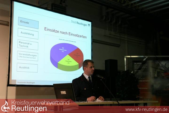 Am Samstagabend stellte Feuerwehrkommandant Harald Herrmann vor rund 350 Angehörigen der Berufsfeuerwehr, der Freiwilligen Feuerwehrabteilungen, der Jugendfeuerwehr und der Altersabteilung sowie einer Vielzahl von Gästen die Einsatzzahlen des vergangenen Jahres vor und zog für die Feuerwehr Reutlingen eine positive Bilanz für das Jahr 2007. „Die Reutlinger Feuerwehr sei gut aufgestellt und fuhr 2007 über tausend Einsätze.