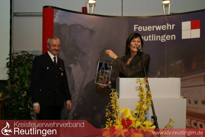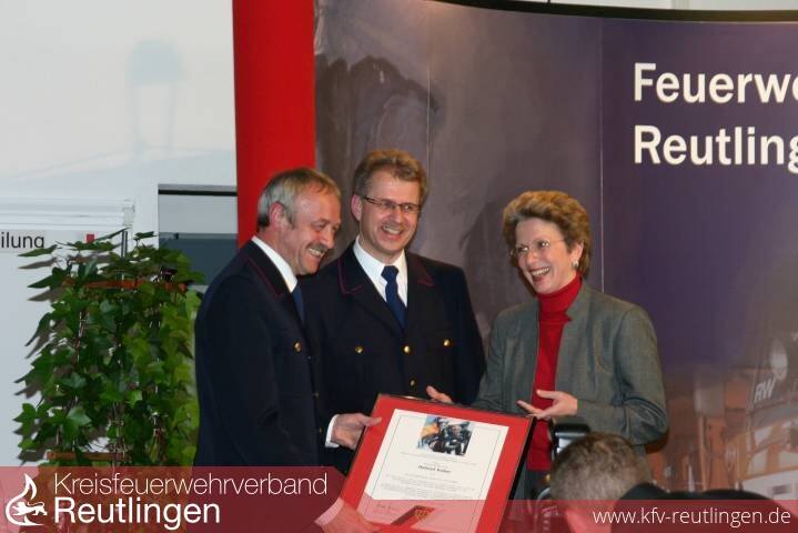 Oberbürgermeisterin Barbara Bosch und Feuerwehrkommandant Harald Herrmann verliehen an Kober die Ehrenmitgliedschaft der Reutlinger Feuerwehr, die höchste Auszeichnung, die die Feuerwehr vergeben darf.