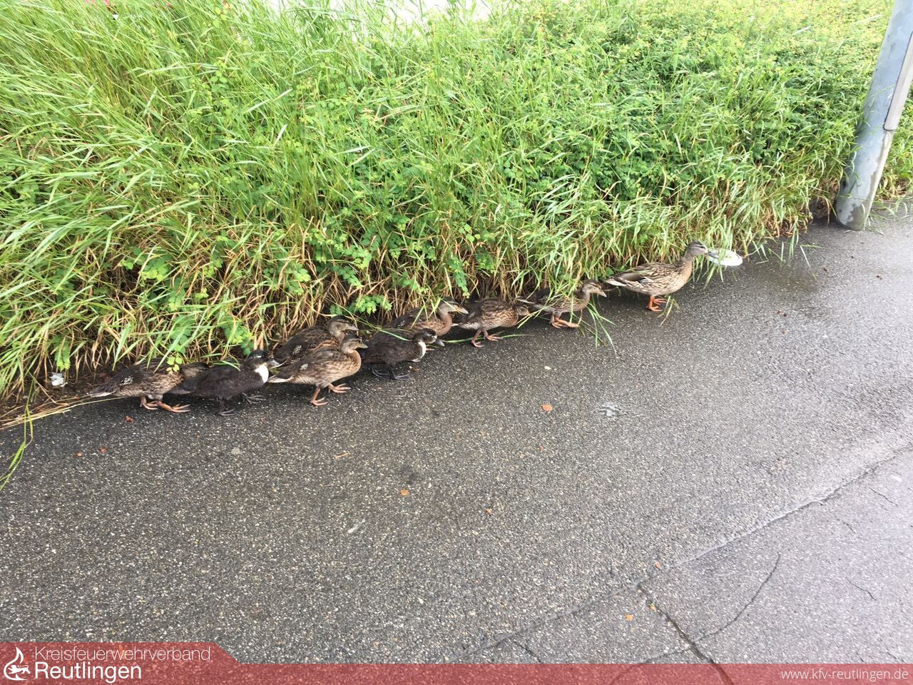 Eine Rettungswagenbesatzung des Malteser Hilfsdienstes hatte die am Straßenrand befindliche neunköpfige Entenfamilie entdeckt und die zufällig vorbeikommenden Feuerwehrkräfte um Hilfe gebeten, da die Entenmutter gerade mit ihren acht Kindern die stark befahrene Rommelsbacher Straße überqueren wollte.