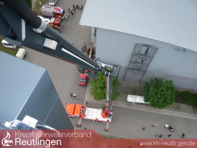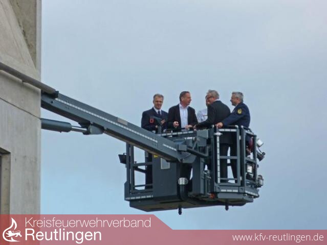 Reinhold Gall zeigte sich beeindruckt von den Einsatzmöglichkeiten des Fahrzeuges und ließ es sich nicht nehmen, zusammen mit Landesbranddirektor Hermann Schröder, dem zuständigen Abteilungsleiter im Innenministerium, Herrn Helmut Hellstern, dem Leiter der Landesfeuerwehrschule, Thomas Egelhaaf und dem Kommandanten der Reutlinger Wehr, im Korb auf 42 m Höhe zu fahren.