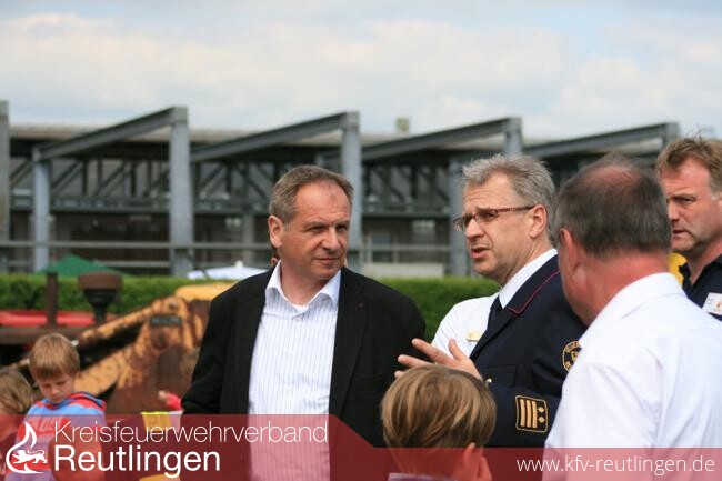 Stadtbranddirektor Harald Herrmann und Landesbranddirektor Hermann Schröder erläuterten dem Baden-Württembergischen Innenminister, Reinhard Gall, die Konzeption und die Einsatzmöglichkeiten des neuen Fahrzeuges, das Modellprojekt für weitere Fahrzeuge im Land sein wird. In jedem Regierungsbezirk sollen nach Auffassung des Innenministeriums künftig ein bis zwei solcher Fahrzeuge vorhanden sein, um bei Industriebränden oder Hilfeleistungen in großen Höhen künftig noch effektiver, vor allem aber auch sicherer arbeiten zu können. Erstmals sei dieses Konzept, so Hermann Schröder, nun bei der Reutlinger Berufsfeuerwehr umgesetzt worden.