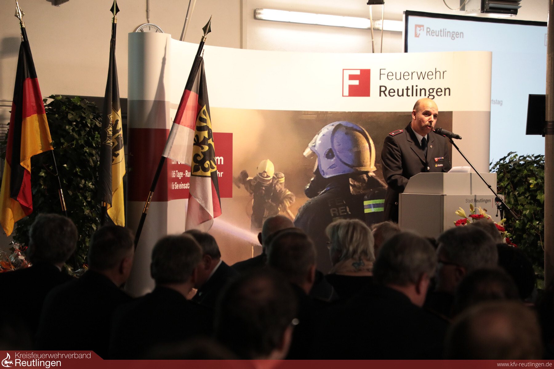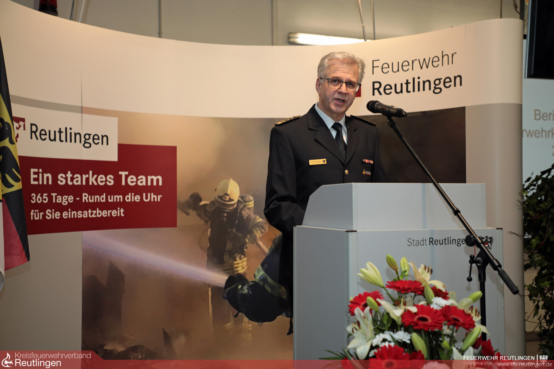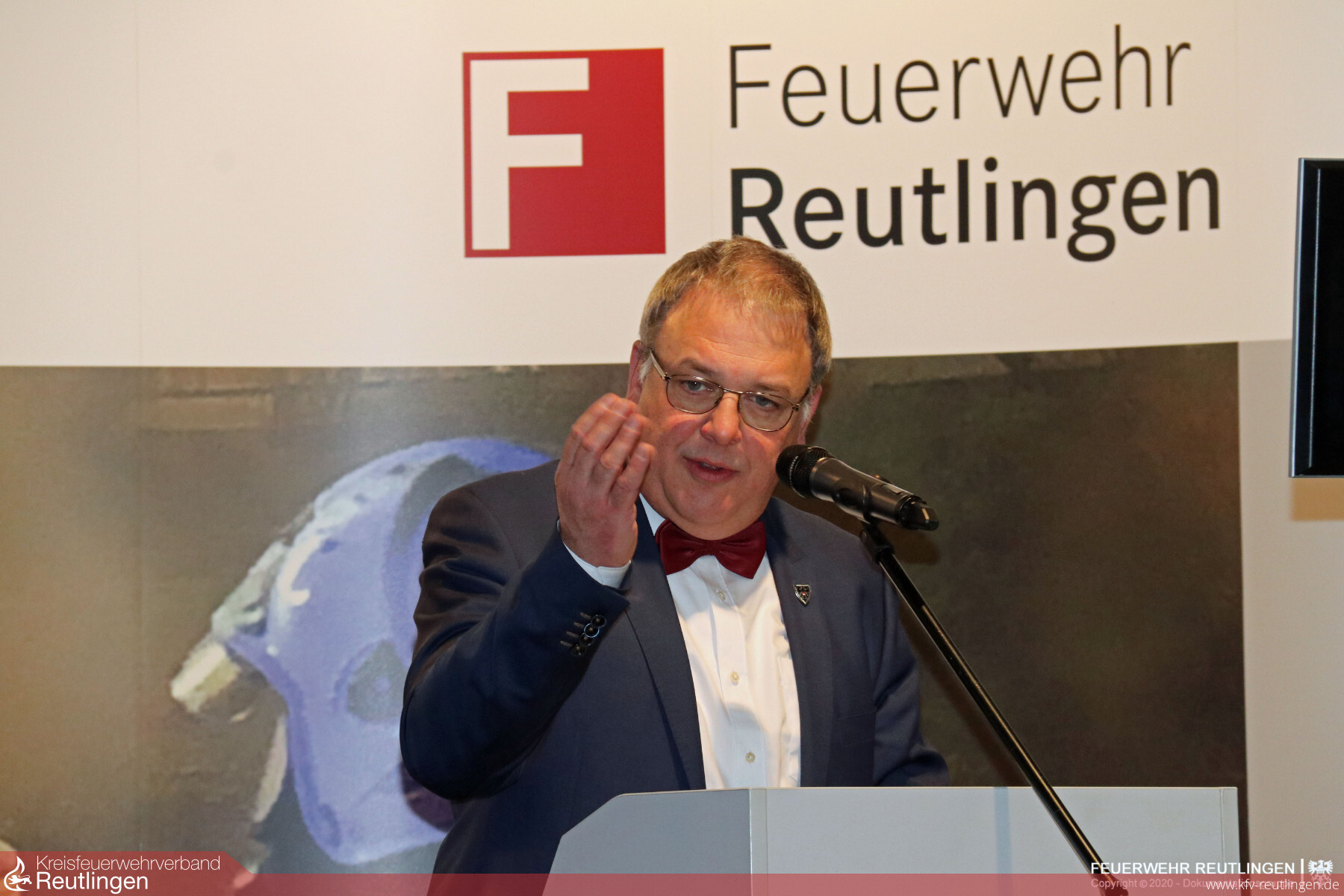 Ein Highlight erlebte die Veranstaltung dann gleich zu Beginn, als Feuerwehrkommandant Harald Herrmann seinen Bericht für das vergangene Jahr 2019 vortrug. Zufrieden könne man auf ein spannendes, arbeitsreiches und turbulentes Jahr mit Licht und Schatten zurückblicken, so Harald Herrmann. Trotzdem, dass der Unfall des Feuerwehrkrans im November für die Kollegen glimpflich ausgegangen war, hatte das Erlebte bei den Feuerwehrangehörigen tiefe Spuren hinterlassen und die Gefahren und Risiken im Feuerwehralltag verdeutlich. „Wir hatten 2019 großes Glück gehabt“, so der Kommandant wörtlich. Mit 1.815 Einsätze pro Jahr waren die Einsatzzahlen auf dem hohen Niveau der Vorjahre geblieben. Dem Umstand, dass Reutlingen 2019 von Unwettern weitgehend verschont blieb, war es zu verdanken, dass die Rekordmarke von 2018 mit über 2.200 Einsätzen unerreicht geblieben war. Personell und technisch gut aufgestellt steht die Feuerwehr immer wieder vor neuen Herausforderungen. Beispielhaft sind die Brände von Elektrofahrzeugen oder zunehmenden Waldbrände im Fokus der Einsatzvorbereitung. Dankbar und stolz über das Geleistete hatte der Reutlinger Feuerwehrkommandant auch Grund zur Sorge. Ein weiterer Rückgang der Hilfsfristen im Zielkonflikt mit den zunehmend geforderten Verkehrsberuhigungsmaßnahmen, die Reform zur Notfallversorgung in den Leitstellen wird nachteilige Auswirkungen für den Brandschutz in Reutlingen und darüber hinaus haben, denen es gemeinsam entgegenzutreten gilt.