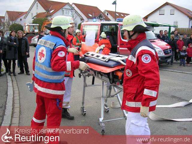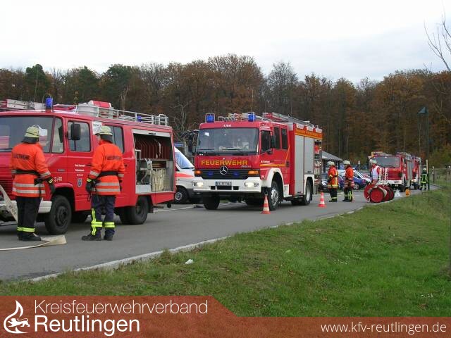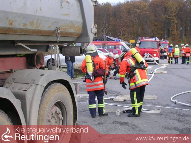 Angenommen wurde ein schwerer Verkehrsunfall auf der Bundesstraße irgendwo auf freier Strecke ohne Wasserversorgung durch Hydranten mit zwei verunfallten Fahrzeugen, in denen jeweils zwei eingeklemmte Personen saßen und einem LKW, dessen Ladung sofort in Vollbrand geriet. Mit dem ersten Fahrzeug der Feuerwehr Großbettlingen, einem Mannschaftstransportwagen, traf Kommandant Michael Henzler und damit der Gesamteinsatzleiter am Unfallort ein. Die kurz nacheinander eintreffenden weiteren Fahrzeuge erhielten von ihm sofort ihren Auftrag. Während sich die Einsatzkräfte des Großbettlinger Löschfahrzeuges um die Insassen des ersten PKW kümmerten übernahm die Besatzung des Grafenberger Löschfahrzeugs die Verletzten des zweiten verunfallten PKW. Das Löschfahrzeug der Abteilung Tischardt, das kein Wasser mitführt, bereitete die Brandbekämpfung des LKW vor und wurde dazu vom Löschfahrzeug der Feuerwehr Frickenhausen mit ihrem 2.000 Liter-Tank mit Wasser versorgt. Schnell wurde klar, dass das mitgeführte Wasser nicht ausreichen würde, weshalb die beiden Tanklöschfahrzeuge aus Grafenberg und Großbettlingen nachalarmiert wurden. Um die Wasserversorgung sicherzustellen entnahm das Tragkraftspritzenfahrzeug aus Grafenberg im Tischardter Gewerbegebiet Wasser aus den Hydranten und befüllte damit die beiden Tanklöschfahrzeuge, die im Pendelverkehr das Wasser zur Einsatzstelle brachten. Die zwischenzeitlich aus Ihren Fahrzeugen befreiten verletzten Personen, alle dargestellt von Mitgliedern der Jugendfeuerwehren, konnten nun der ebenfalls eingetroffenen Bereitschaft Großbettlingen-Grafenberg des Deutschen Roten Kreuz zur weiteren Versorgung übergeben werden. Nachdem nun alle Personen gerettet und der LKW gelöscht war konnte mit den gemeinsamen Aufräumarbeiten begonnen werden. Insgesamt waren an der Übung 8 Fahrzeuge der Feuerwehren, 3 Fahrzeuge des DRK und ca. 60 Einsatzkräfte beteiligt. Zur anschließenden Manöverkritik trafen sich alle im Grafenberger Gerätehaus, bei der sich alle Führungskräfte und Abschnittsleiter zufrieden zeigten. Die vorrangigsten Ziele, Aufbau einer Führungsstruktur, Bildung von Einsatzabschnitten und vor allem das gegenseitige Kennenlernen der Feuerwehrleute untereinander seien erreicht worden, waren sich alle Einig. Zum Schluss dankte Kommandant Stefan Kleemann aus Grafenberg allen beteiligten für Ihren Einsatz und ihr Mitwirken und lud alle noch zu einem kleinen Vesper in gemütlicher Runde ein.