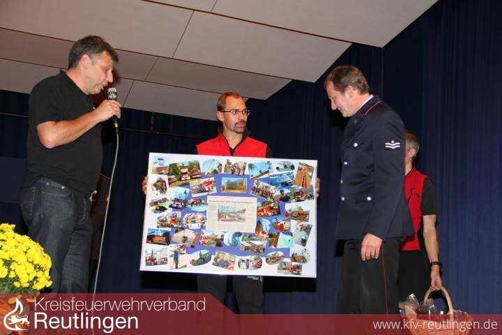 Die Feuerwehr aus Villingen-Schwenningen überreichte den Kameraden der Feuerwehrabteilung Oferdingen der Feuerwehr Reutlingen am Rande des Helferfestes ein Bild als Erinnerung an die gemeinsamen Einsatzstunden zur Beseitigung der Hagelschäden.