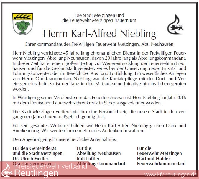 Die Stadt Metzingen und die Feuerwehr Metzingen trauern um