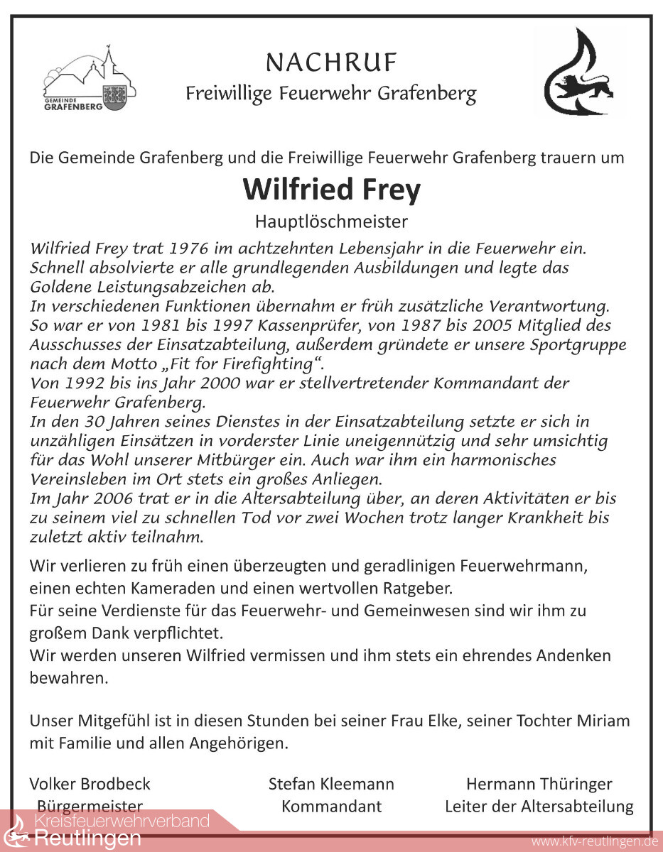 Wilfried Frey trat 1976 im achtzehnten Lebensjahr in die Feuerwehr ein. Schnell absolvierte er alle grundlegenden Ausbildungen und legte das Goldene Leistungsabzeichen ab. In verschiedenen Funktionenüernahm er früh zusätzlich Verantwortung. So war er von 1981 bis 1997 Kassenprüfer, von 1987 bis 2005 Mitglied des Ausschusses der Einsatzabteilung, außerdem gründete er unsere Sportgruppe nach dem Motto „Fit for Firefighting“. Von 1992 bis ins Jahr 2000 war er stellvertretender Kommandant der Feuerwehr Grafenberg. In den 30 Jahren seines Dienstes in der Einsatzabteilung setzte er sich in unzähligen Einsätzen in vorderster Linie uneigennützig und sehr umsichtig für das Wohl unserer Mitbürger ein. Auch war ihm ein harmonisches Vereinsleben im Ort stets ein großes Anliegen. Im Jahr 2006 trat er in die Altersabteilung über, an deren Aktivitäten er bis zu seinem viel zu schnellen Tod vor zwei Wochen trotz langer Krankheit bis zuletzt aktiv teilnahm.