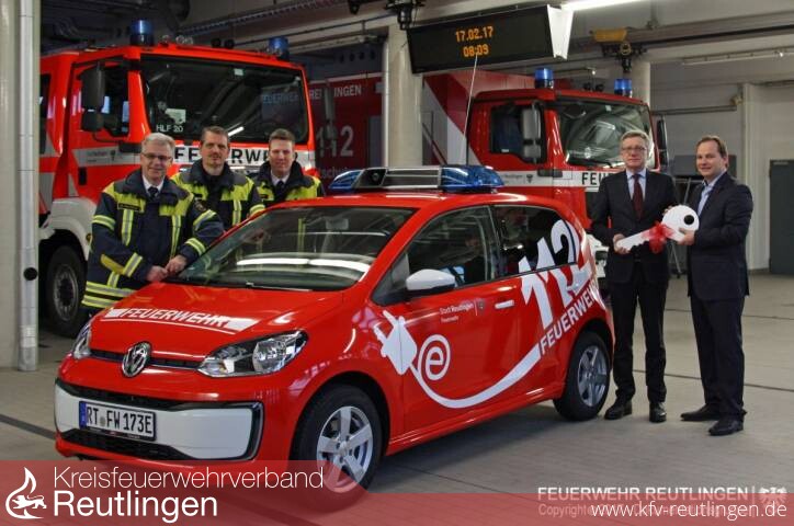 Nach einer Marktrechere und Ausschreibung konnte Axel Maier, Geschäftsführer des Autohauses AMW aus Tübingen, am vergangenen Freitag den rund 23.000 € teuren neuen VW e-up offiziell an die Feuerwehr Reutlingen übergeben.