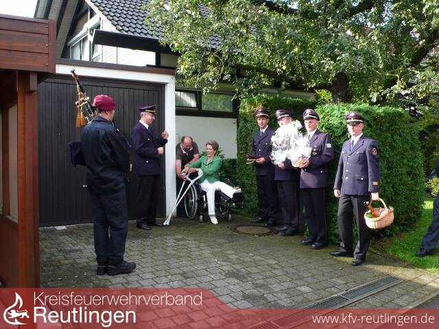 In Degerschlacht gratuliere Feuerwehrkommandant Harald Herrmann, seine Stvellvertreter Dr. Georg Belge und Gerhard Nagel ihrer Chefin im Namen aller Abteilungen der Feuerwehr und wünschte für die zweite Lebenshälfte,Glück, Gesundheit und weiterhin viel Erfolg. Sie überreichten Frau Bosch eine Dienstmütze, die sie als oberste Feuerwehrchefin kenntlich machen soll.