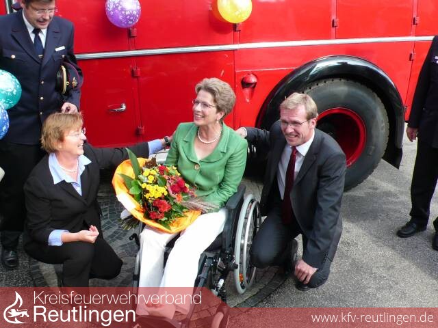Im alten Rüstkranwagen RKW 7 (Baujahr 1954), geschmückt mit bunten Luftballons, wurde Frau Oberbürgermeisterin Bosch - eskortiert vom Löschzug der Berufsfeuerwehr - von Degerschlacht ins Reutlinger Rathaus gefahren.