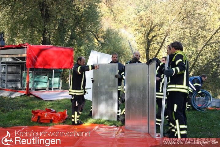 Die Ölschadensmeldung, die einen Großeinsatz der Feuerwehr zum Schutz der Umwelt nach sich zieht, war glücklicherweise nur inszeniert und eine groß angelegte Einsatzübung der Reutlinger Feuerwehr mit dem Ziel, die Umsetzung des Einsatzplanes und die Handhabung der Ölwehrausrüstung sowie deren Praxistauglichkeit zu überprüfen.