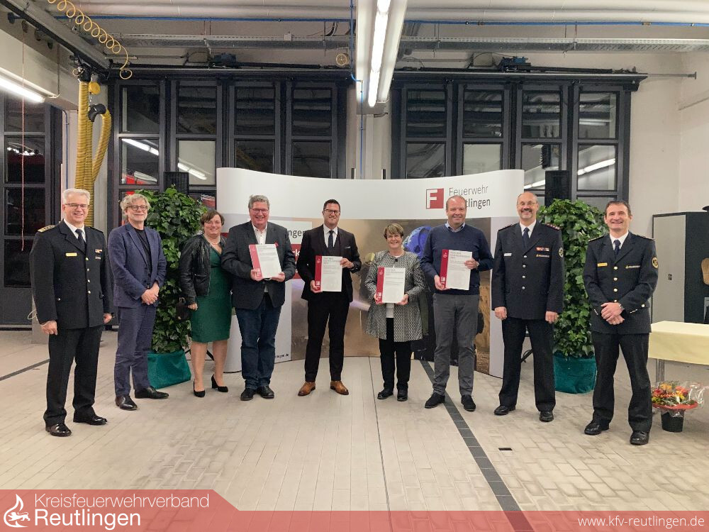Mit dem Förderschild „Partner der Feuerwehr“ des Deutschen Feuerwehrverbandes wurde die Arztpraxis Dr. Markus Böbel, die Reutlinger Stadtverkehrsgesellschaft RSV, die Karl Mayer Stoll Textilmaschinenfabrik GmbH und die Firma Schöpfer GmbH & Co. KG ausgezeichnet.
