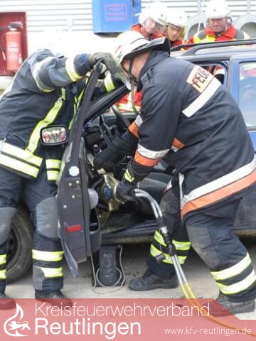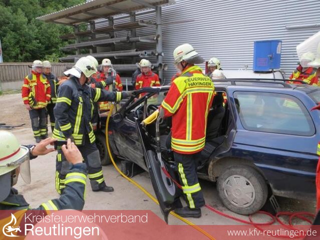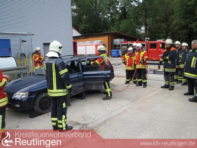 Bei einem Verkehrsunfall, bei dem Personen im Fahrzeug eingeklemmt wurden, gilt es die Patienten schonend aus dem deformierten Fahrzeug zu befreien. Die Feuerwehr muss daher den Umgang mit ihren hydraulischen Rettungsgeräten, wie Spreizer und Schere sicher beherrschen. Neuerungen in der Fahrzeugtechnik und die daraus resultierenden neuen Erkenntnisse in der Unfallrettung führen dazu, dass sich die Feuerwehrangehörigen laufend weiterbilden müssen. Dies war auch der Grund dafür, im Landkreis Reutlingen ein Portal zu schaffen, um solche speziellen Kenntnisse weiterzuvermitteln. In Bad Urach fand daher vom 24.06.2013 bis 26.06.2013 das erste Seminar dieser Art statt. An drei Abenden erhielten die 27 Teilnehmer in Theorie und Praxis all das Wissen vermittelt, um für die technische Rettung bei Verkehrsunfällen die richtigen Maßnahmen treffen zu können. Hinweise zur modernen Kraftfahrzeugtechnik, zu Sicherheitseinrichtungen bei den unterschiedlichen PKW-Modellen, wie auch Einsatzgrundsätze gehörten am ersten Abend zum Theorieunterricht im Lehrsaal des Feuerwehrhauses.
