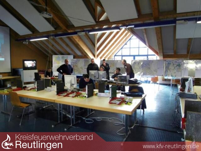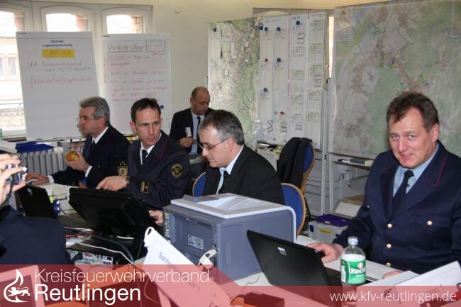 Dort war der Kommandant der Reutlinger Feuerwehr, Oberbrandrat Harald Herrmann für das Sachgebiet Lage verantwortlich. Auch Brandrat Dr. Georg Belge war in diesem Einsatzstab - zuständig für die elektronischen Lagesysteme - eingesetzt.