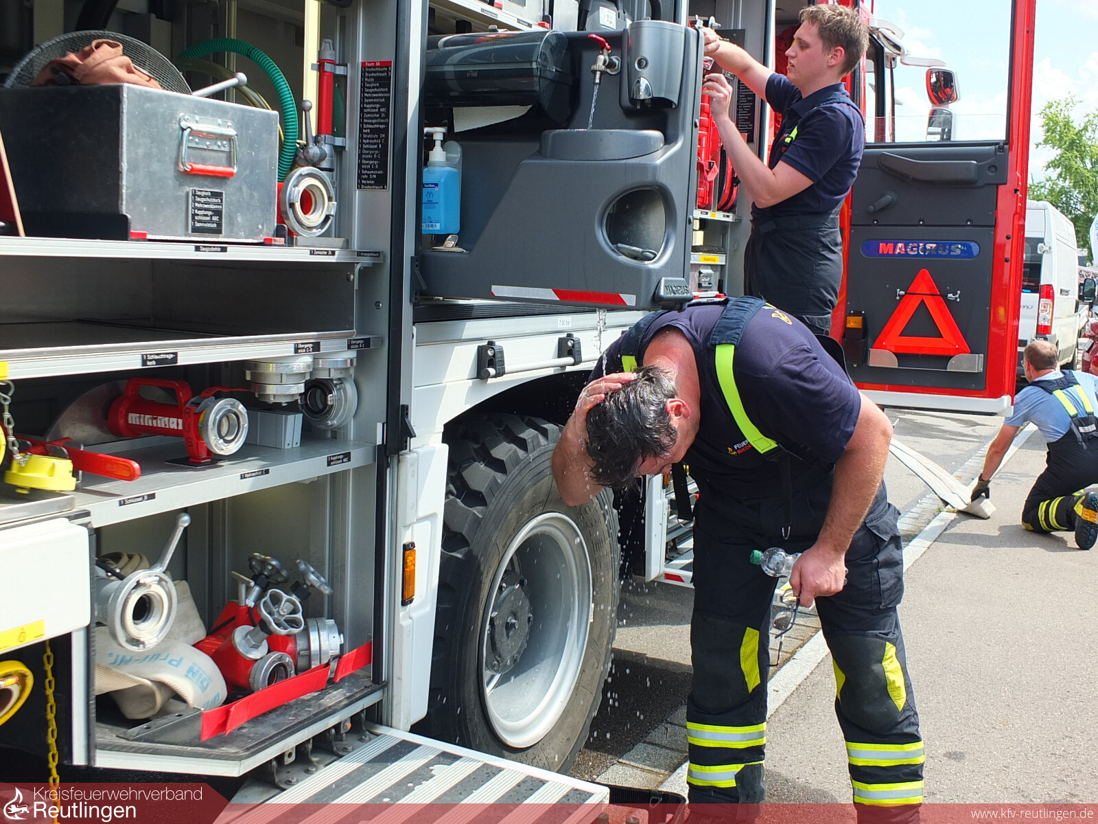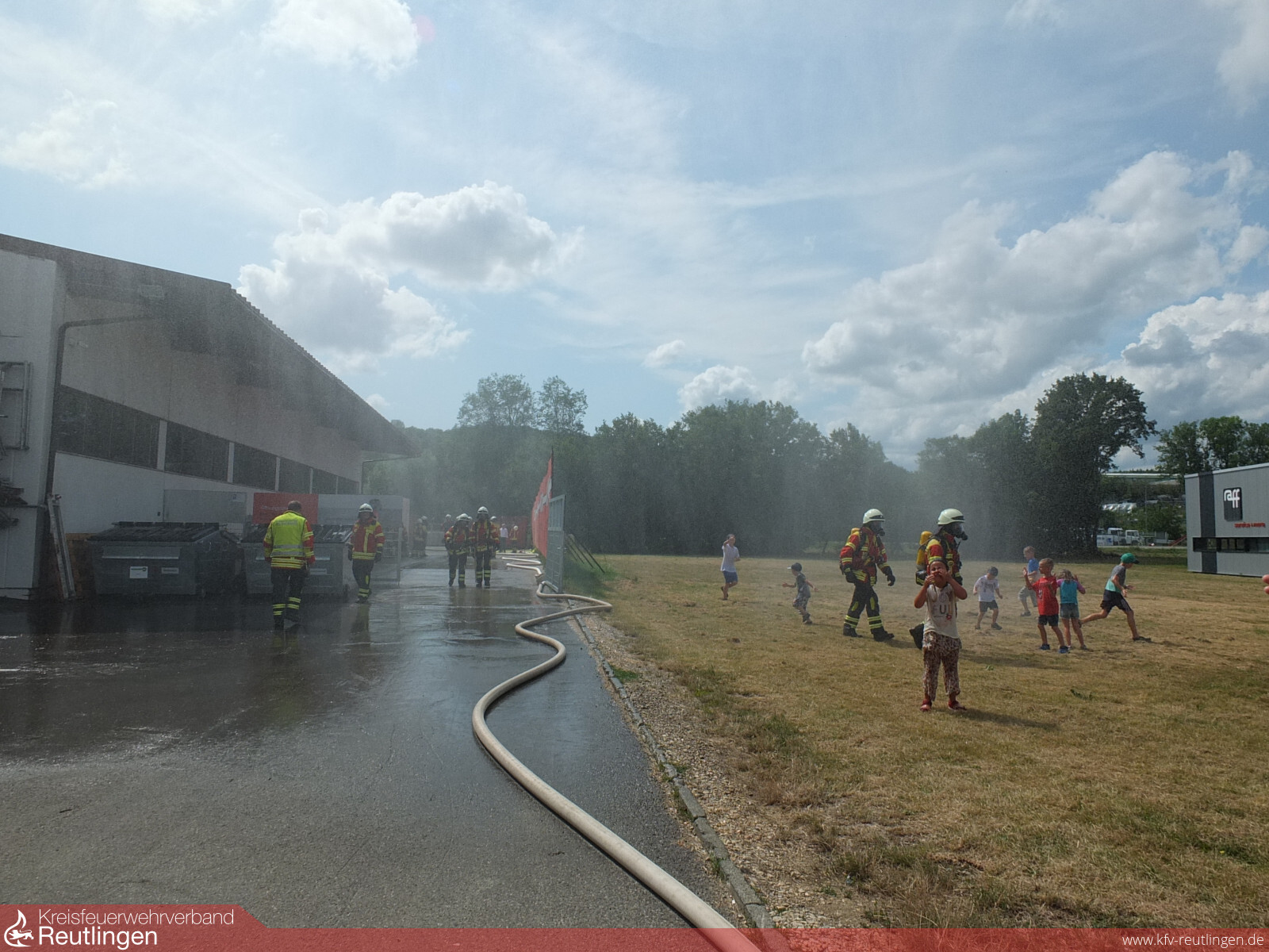 Bei über 35 °C war diese Schauübung eine besondere Herausforderung für die Einsatzkräfte und die Zuschauer. Umso mehr freut es uns, dass wir so viele Gäste begrüßen durften. Für die Kinder gab es am Ende noch ein vorgezogenes Ferienprogramm: Unter der Riesendusche der Drehleiter konnte man sich super abkühlen und hatte einen riesen Spaß.