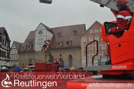 Die jugendlichen Retter kriechen auf dem Boden herum, löschen nebenbei noch einen Brand in der Nähe des »Opfers« und ziehen die Übung tapfer durch. Inzwischen strömt der Regen immer stärker, die Stimmung der Besucher sinkt zunehmend und immer mehr von ihnen ziehen sich in die Geschäfte zurück. Einer, der das Wetter nimmt wie's kommt, ist Harald Klingler aus Bad Urach. »Das ist doch eine gute Gelegenheit, nach draußen zu gehen, wenn so was geboten ist«, findet er. Hauptsächlich sei er aber wegen der Enkel da, sagt er und grinst.